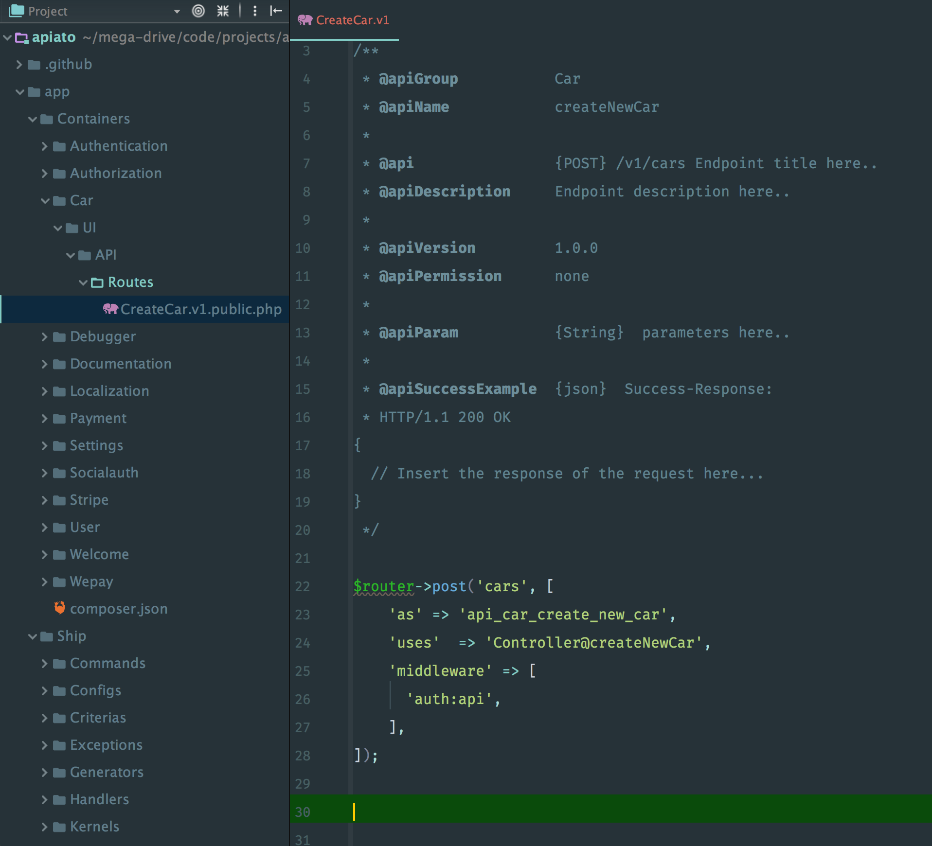 Apiato code generator works the same way. And in addition it can generate a full Container with fully working CRUD operations, including routes, requests, controller, Actions, Repositories, Models, Migrations, documentation…. and much more)